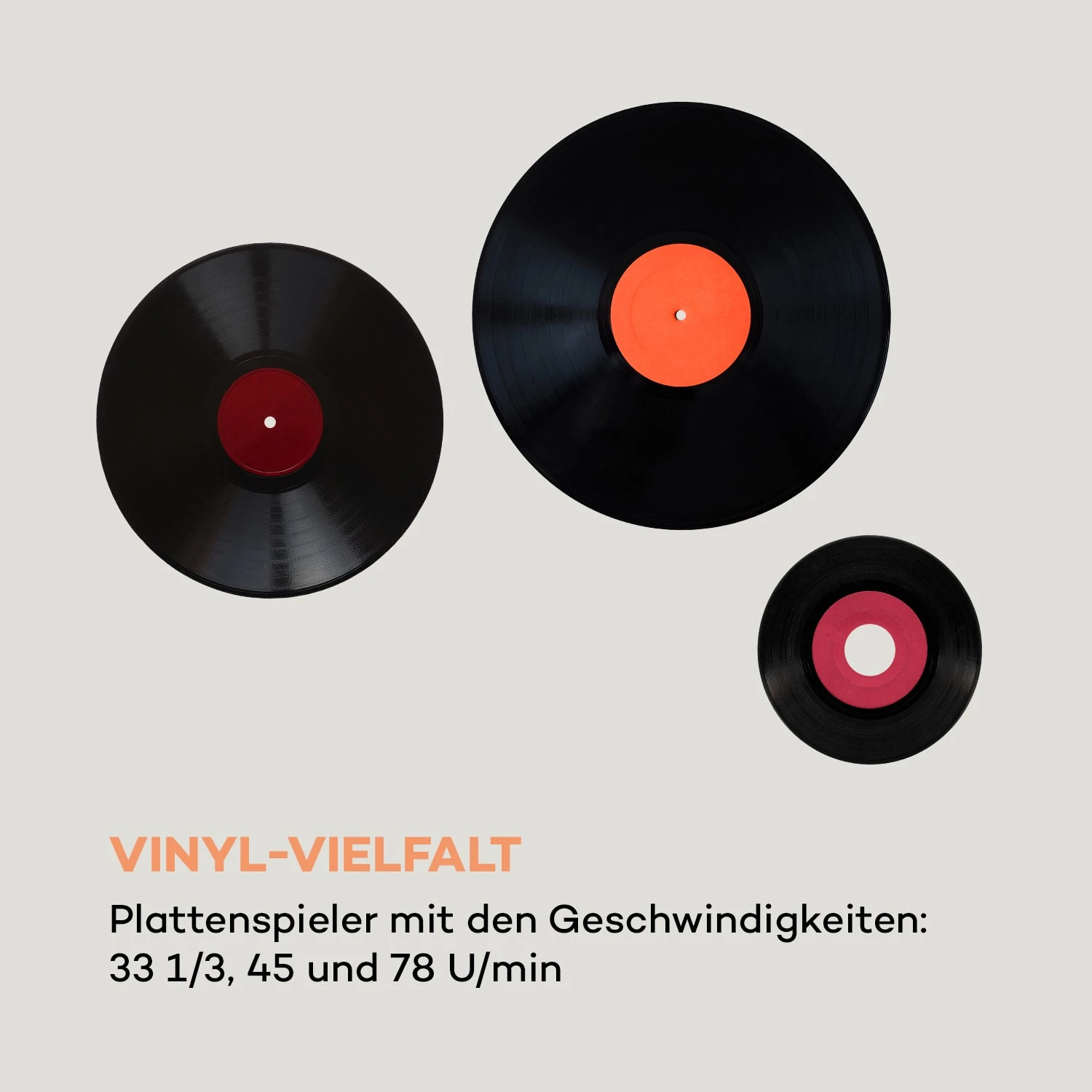 - Abspielgeschwindigkeiten Plattenspieler: 33 1/3, 45 und 78 U/min