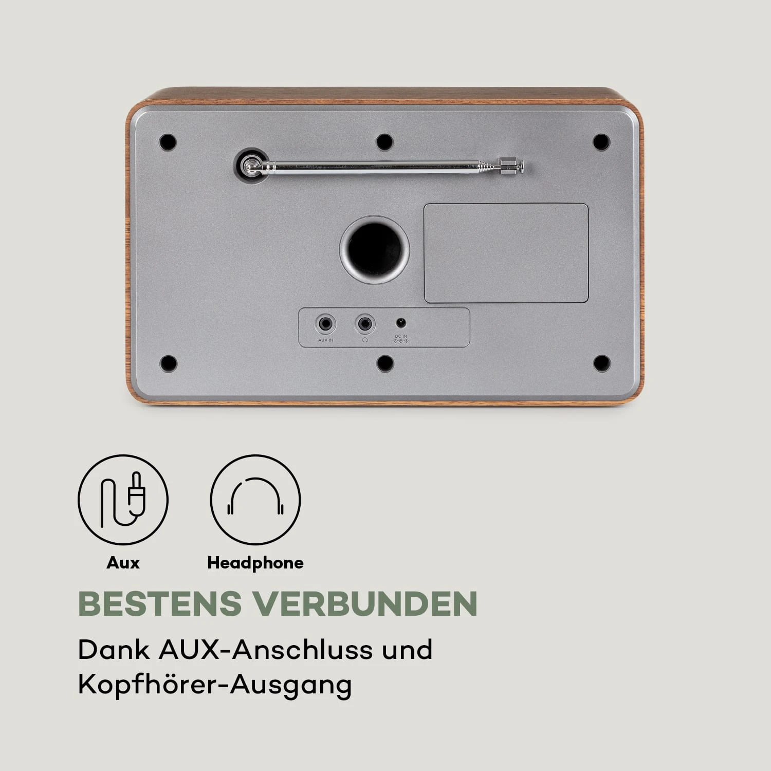 - Anschlüsse: 1 x 3,5-mm-Klinken-AUX-Eingang, 1 x 3,5-mm-Klinken-Kopfhörer-Ausgang