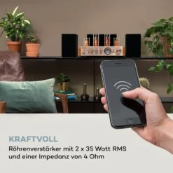 Die ganze Welt des Radios findet im auna Connect Vinyl Cube Platz: Mit der kompletten Palette aus Internet-, DAB+ und UKW-Radio stehen bis zu 10.000 Sender zur Auswahl, um jeden Radiogeschmack zufrieden zu stellen. Neben dem Smart Radio ist der topseitige Plattenspieler unzweifelhaft das akustische Herz der Anlage. Hier finden die Vinyls mit 33, 45 oder 78 Umdrehungen problemlos ein modernes Wiedergabegerät und lassen den beliebten Schallplattensound zum Leben erwachen. Daneben verfügt die Anlage über integriertes WiFi sowie über einen USB-Port und einen AUX-Eingang, über die unzählige MP3s und Audio-Dateien abgespielt werden können. Natürlich ist auch eine drahtlose Bluetooth-Funktion von der Partie. So ermöglicht der Connect Vinyl Cube zuverlässiges Audio-Streaming per Smartphone, Tablet oder Laptop. Auch die Steuerung ist denkbar einfach. Entweder direkt am Gerät, per Fernbedienung oder per AirMusic-App von Smartphone oder Tablet können alle Funktionen genutzt werden. Damit Sie genau wissen, was Sie tun, besitzt die Anlage ein übersichtliches 2,4″ TFT Farbdisplay mit HCC Display-Technologie. Das hilft nicht nur bei der Steuerung, sondern zeigt auch Radio-Infotexte, Musiktitel und Uhr- oder Alarmzeiten an.