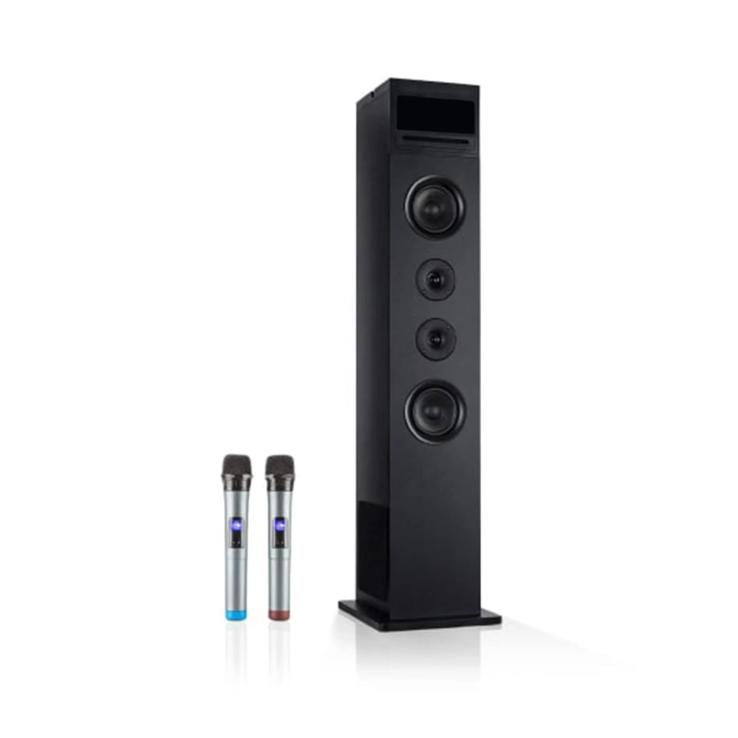Der Standlautsprecher nimmt mit seinen geringen Stellmaßen kaum Platz ein und passt aufgrund des klaren Designs zu jedem Wohnambiente. Besonders praktisch: An der Oberseite gibt es eine Tablethalterung, ein Smartphone kann zusätzlich sicher abgelegt werden. Im Lieferumfang sind zwei kabellose Mikrofone enthalten, damit die Karaoke-Party sofort losgehen kann: Einfach ein Mikrofon einschalten, den Gerätemodus wählen und mit dem Singen beginnen!