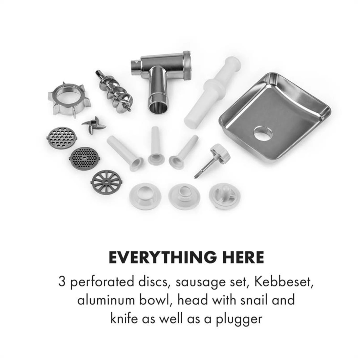 Mit 700 Watt Arbeitspower dreht der Kupfermotor unseres Klarstein Kraftprotz Fleischwolfs die Schnecke und das daran befindliche Edelstahlmesser in zwei wählbaren Geschwindigkeiten. So werden unermüdlich die zugeführten Fleischstücke zerkleinert und durch eine von drei Lochscheiben – fein, mittel oder grob – gepresst. Heraus kommt frisches Hack, das du zu Buletten, frischen Mettbrötchen, als leckere Füllung in Krautrouladen uvm. weiterverarbeiten kannst. Oder du nutzt die große Aluminiumschale um fertig gewürzte Fleischstücke mit Hilfe des Wurstaufsatzes in selbstgemachte Würste zu füllen. Egal ob Leber- oder Bratwurst, hier bestimmst du, was in den Darm kommt. Damit ist der Funktionsumfang des Klarstein Kraftprotz Fleischwolfs noch nicht erschöpft: Mit dem Kebbeaufsatz lassen sich die leckeren, gefüllten Bulgurklöße ohne viel Aufwand zubereiten. Und bleibt doch einmal ein Fleischstück in der Schnecke stecken, wird es entweder per Rücklauf oder mit extrem starken 1800 Watt Blockierleistung wieder gelöst.