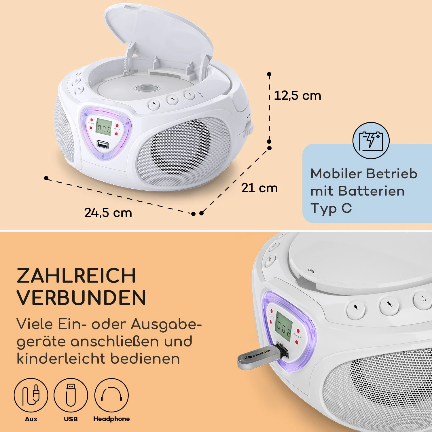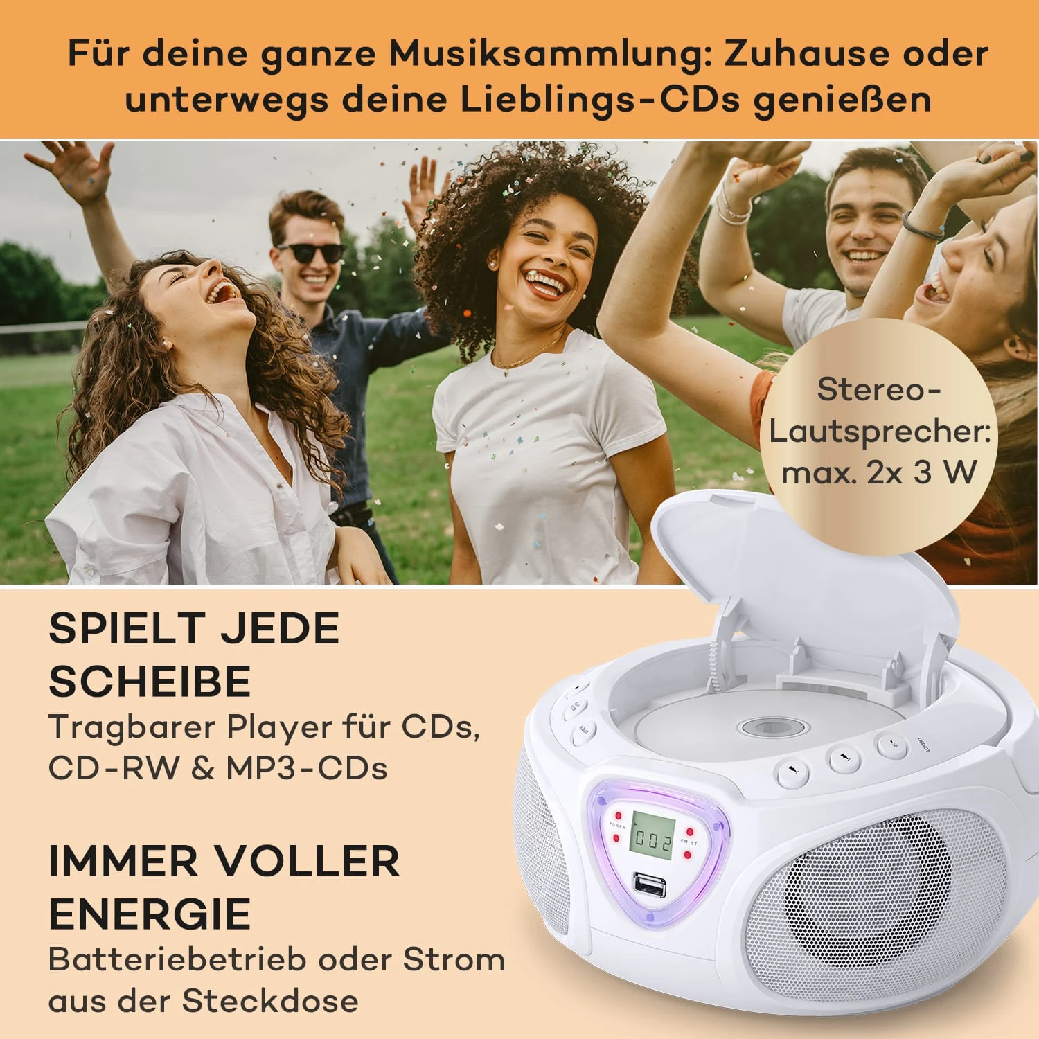 Flashdance! Die auna Roadie CD Boombox lässt die Farben tanzen und bringt mit CD-Player, Bluetooth 5.0 Konnektivität und FM-Radio ordentlich Schwung in die Hütte.