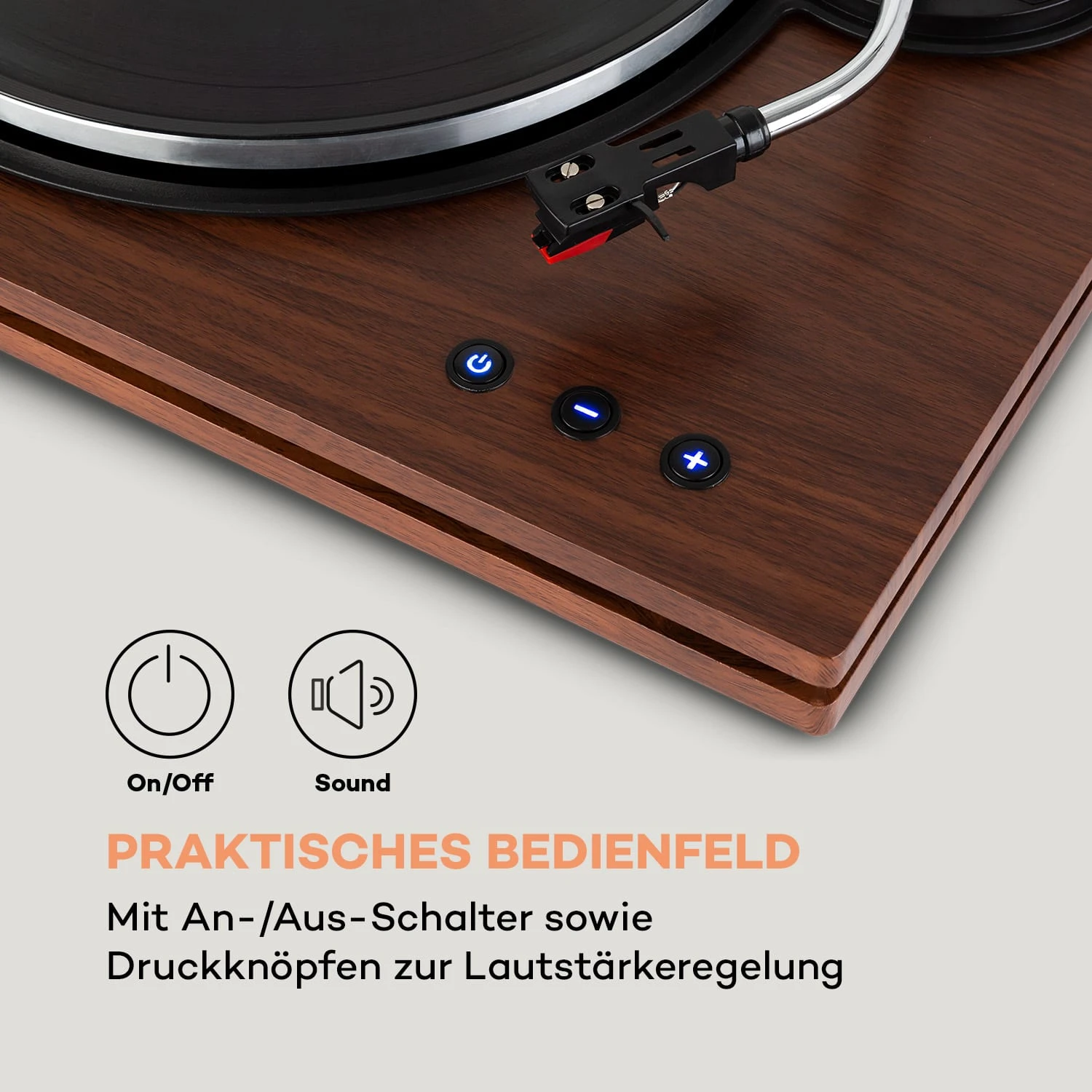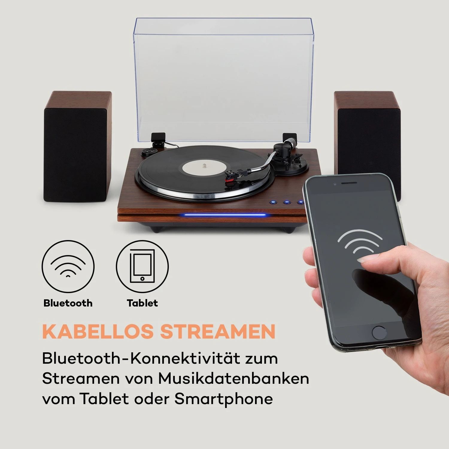 Der TT-Play PLUS bringt Schallplatten dank seinem Riemenantrieb zuverlässig mit Geschwindigkeiten von 33 und 45 Umdrehungen pro Minute zum Rotieren. Der Tonarm des eleganten Gerätes wird mit einem separaten Gegengewicht manuell eingestellt, um das ideale Auflagegewicht für den Stereo-Keramikabnehmer zu erreichen. Per Pitch Control Regler kann die Drehgeschwindigkeit um 10 % nach oben oder unten geregelt werden. Wem gerade nicht der Sinn nach Vinyl steht, hat darüber hinaus die Möglichkeit, per Bluetooth-Funktion kabellos Verbindung zu Musikdatenbanken auf Smartphone oder Tablet aufzunehmen und diese über den auna TT-Play PLUS Plattenspieler zu streamen. Eine blaue Status-LED an der Front gibt zudem zuverlässig über die Aktivierung der Bluetooth-Funktion Auskunft. Der Klang des vielseitigen Plattenspielers wird über die separaten Stereolautsprecher mit einer Leistung von je 5 Watt RMS ausgegeben, die spielend einfach über die Speaker-Ausgänge angeschlossen werden können. Sofern der TT-Play PLUS gerade nicht verwendet wird, ist er unter einem Staub-Cover sicher vor Verschleiß und Staubpartikeln bis zu seinem nächsten Einsatz geschützt. Mit seinem klassischen und eleganten Design fügt sich der Plattenspieler ideal in jedes Wohnambiente ein.