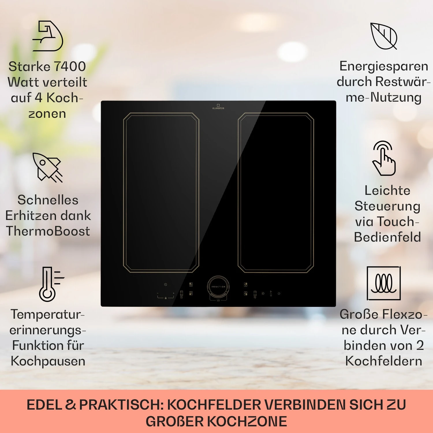 - Bitte beachte: Die Gesamtleistung kann 7400 Watt nicht überschreiten, in diesem Fall regeln die Kochzonen automatisch ab.